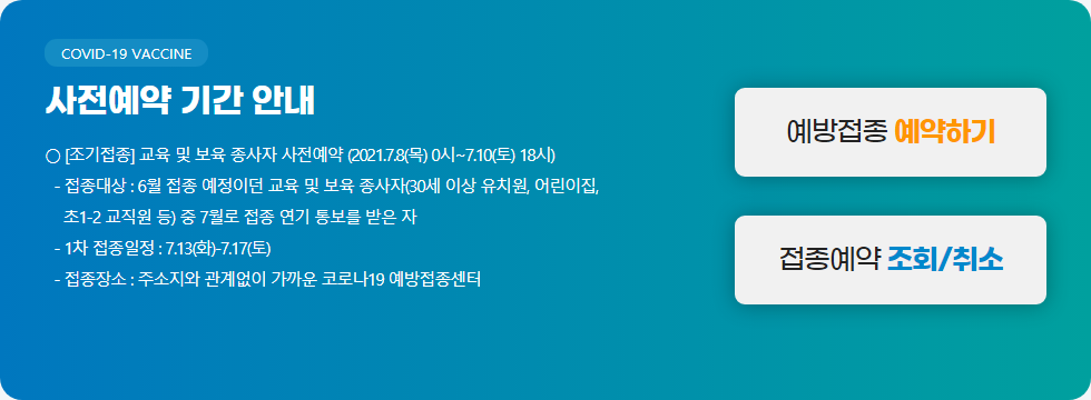 대상자들은 백신 종류와 접종 장소가 바뀌었기 때문에 30일 오후 6시까지 사전예약 홈페이지나 질병관리청 콜센터, 각 지방자치단체 콜센터에서 다시 사전예약을 해야 합니다. 대리예약의 경우에 예약자의 본인인증으로 인증이 가능합니다. 백신 접종 예약방법 먼저, 백신 접종 홈페이지 에 접속합니다. 콜센터로 전화예약이 가능하나 통화량이 몰릴 경우 일시적으로 연결이 지연될 수 있으므로 24시간 예약이 가능한 온라인 (모바일, 누리집) 예약을 권장됩니다. 60세 이상 모든 연령층 (60∼74세)에서 사전예약이 가능하며, 예약은 6월 3일까지 진행됩니다.